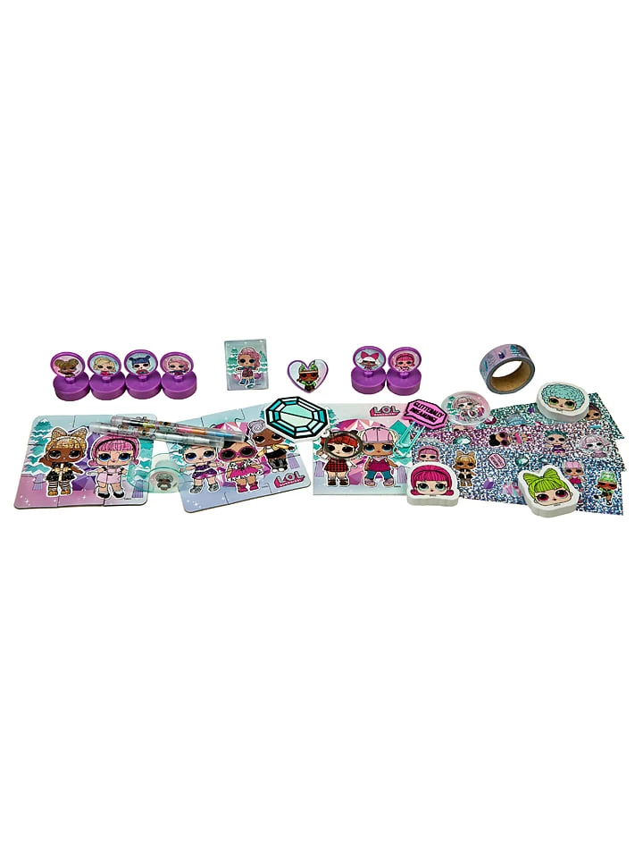 – Inhalt: : 6 Mini-Stempel, 2 Puzzles, Schlüsselanhänger, Klebeband + Abroller, 3 Lasersticker, Mini-Pop-Up Bleistift, Mini-Pop-Up Wachsmalkreiden, 2 Wackelsticker, 2 Papierclips, Blöckchen mit Malvorlagen, 3 Radierer, Washi Tape