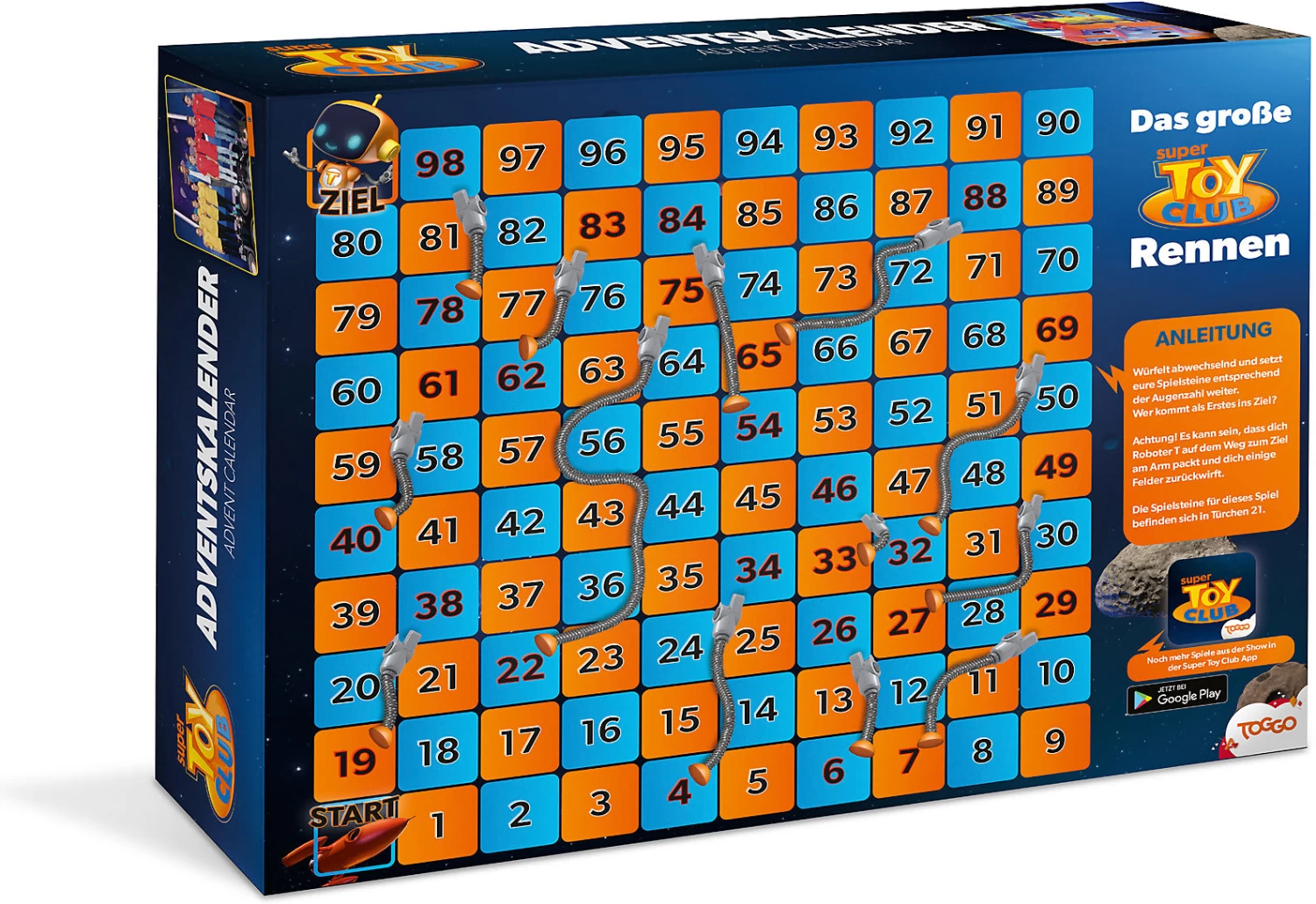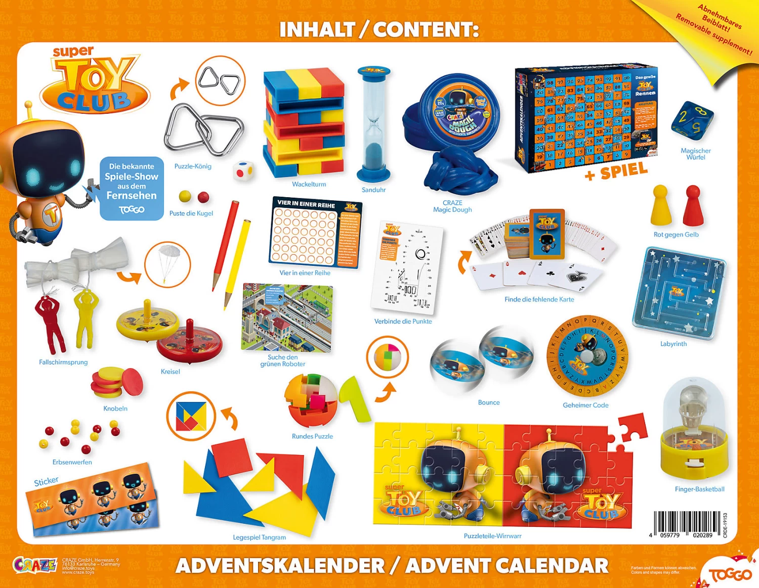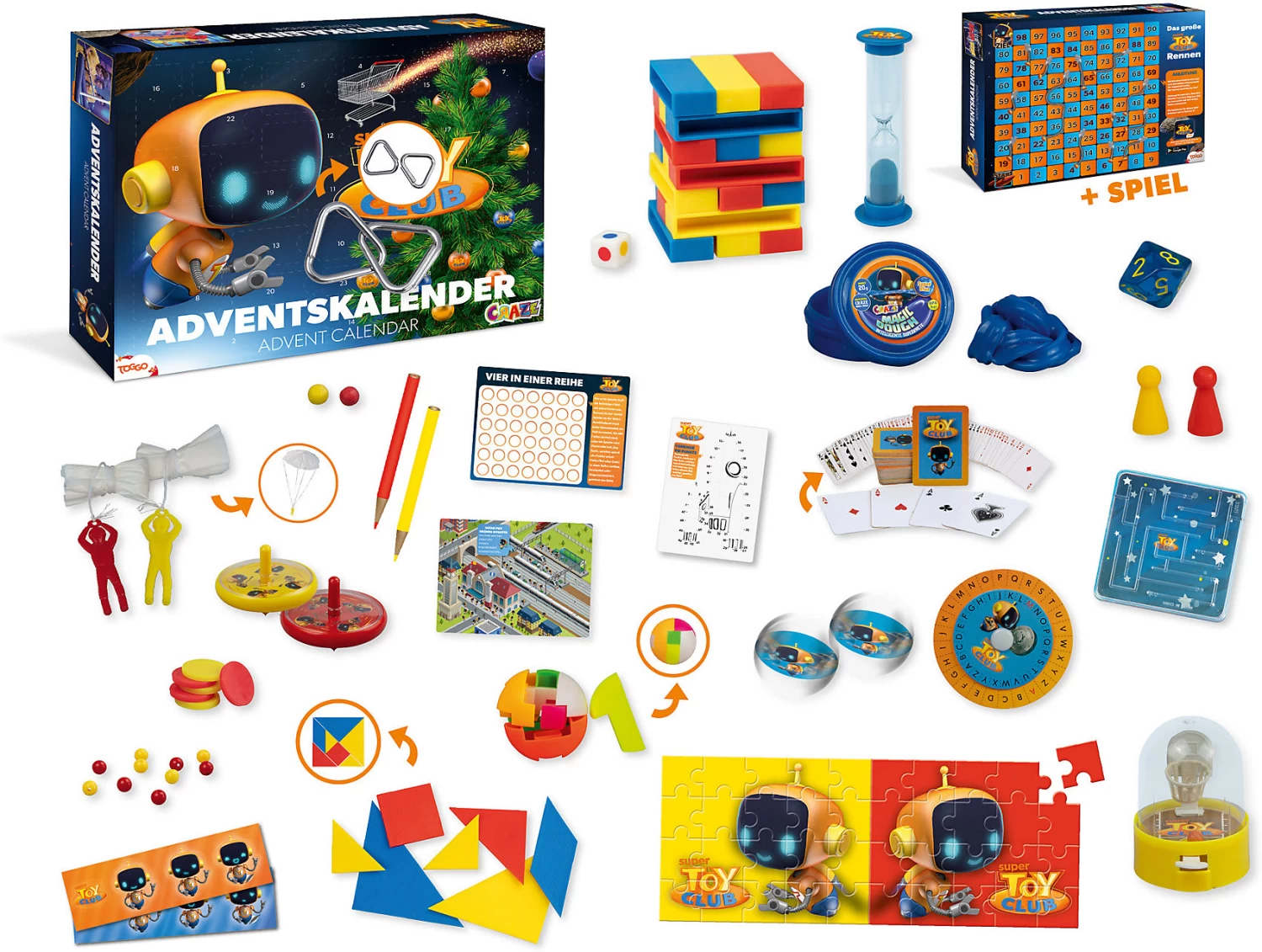 Der Super Toy Club-AK ist der AK zu der beliebten und überaus erfolgreichen Super-RTL Spiel-Actionshow “SUPER TOY CLUB“. Wie in der Sendung auch, geht es auch beim AK um das Lösen kniffeliger Aufgaben rund um Wissen und Geschicklichkeit. Dabei spielen immer ein gelbes und ein rotes Team gegeneinander. Der AK greift diese Spielsystematik auf und liefert an 24 Tagen immer wieder aufs Neue spannende zu lösende Aufgaben, welche man immer gegen einen Mitspieler im Wettkampf bestreitet. Der Kalender bietet somit Spaß für die ganze Familie und zusätzlich können die Aufgaben immer wieder gelöst werden. Sollte sich im Übrigen einmal kein Mitspieler finden – auch nicht schlimm – es können nämlich alle Aufgaben auch alleine gelöst werden.