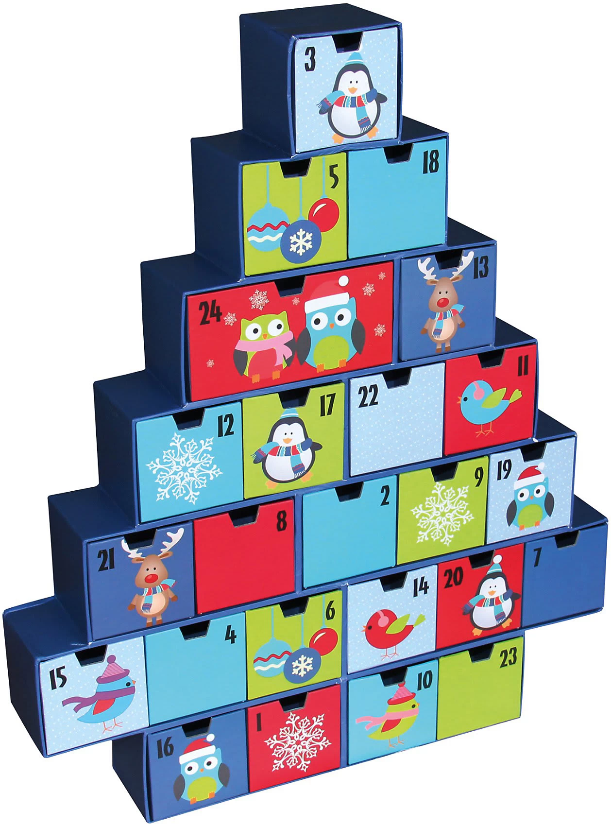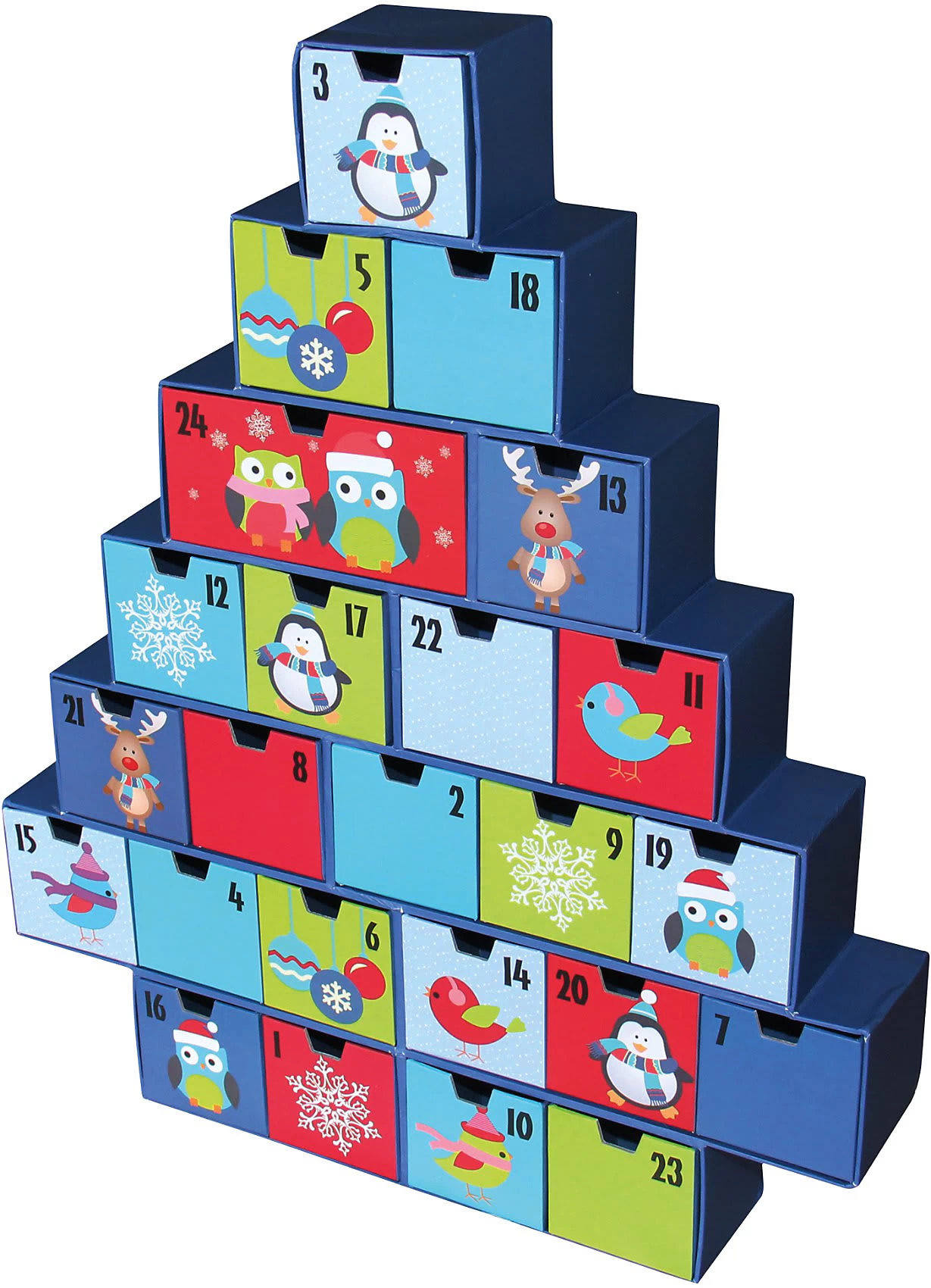 Der Weihnachtskalender verfügt über 24 liebevoll gestaltete Schubladen, welche individuell befüllt werden können. Süßigkeiten, Weihnachtsgrüße und kleine Geschenke finden in den Schubfächern genügend Platz und überraschen die lieben Kleinen jeden Tag aufs Neue. Die farbenfrohen Motive verleihen dem Kalender einen außergewöhnlichen Look und machen ihn zu einem dekorativen Element im Kinderzimmer.