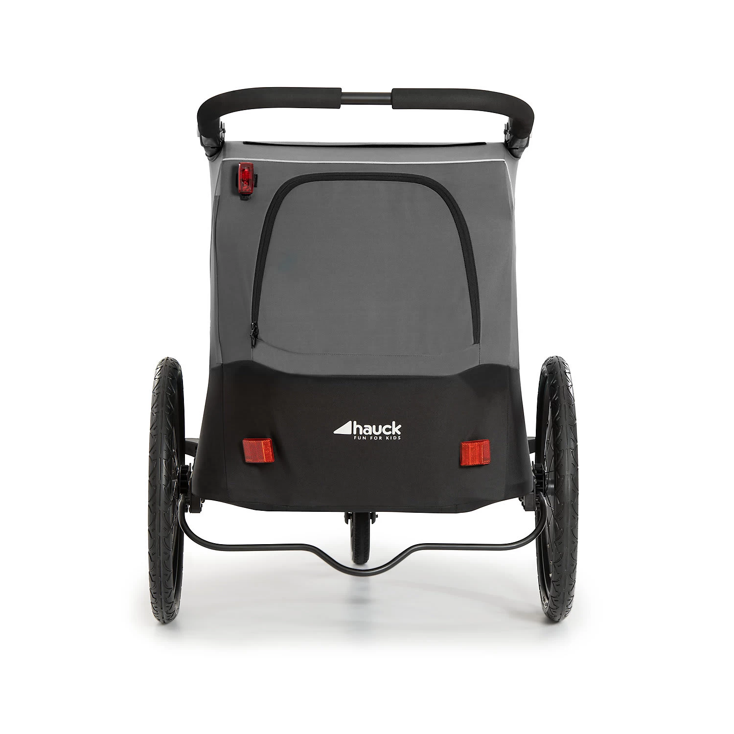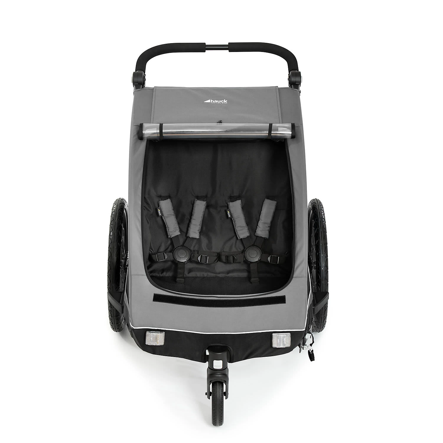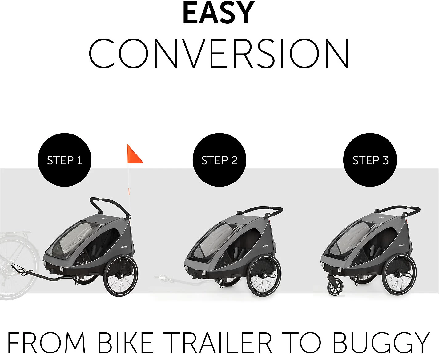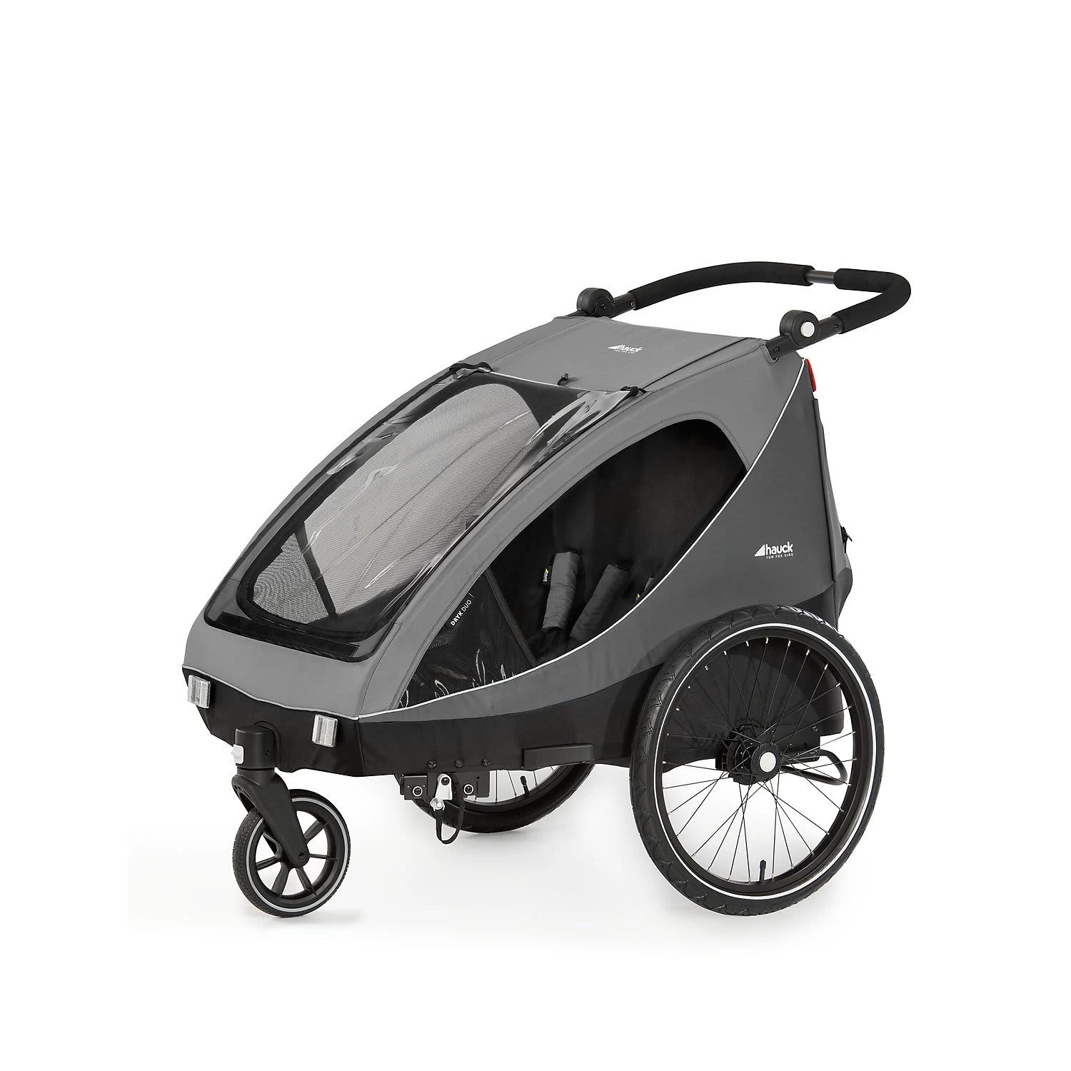 Der Dryk Duo von hauck vereint besonders praktisch und komfortabel Fahrradanhänger und Buggy in einem. Die mühelose Handhabung macht ihn zu einem treuen Begleiter, da der Umbau in nur vier Schritten funktioniert und er darüber hinaus einhändig gefaltet werden kann.