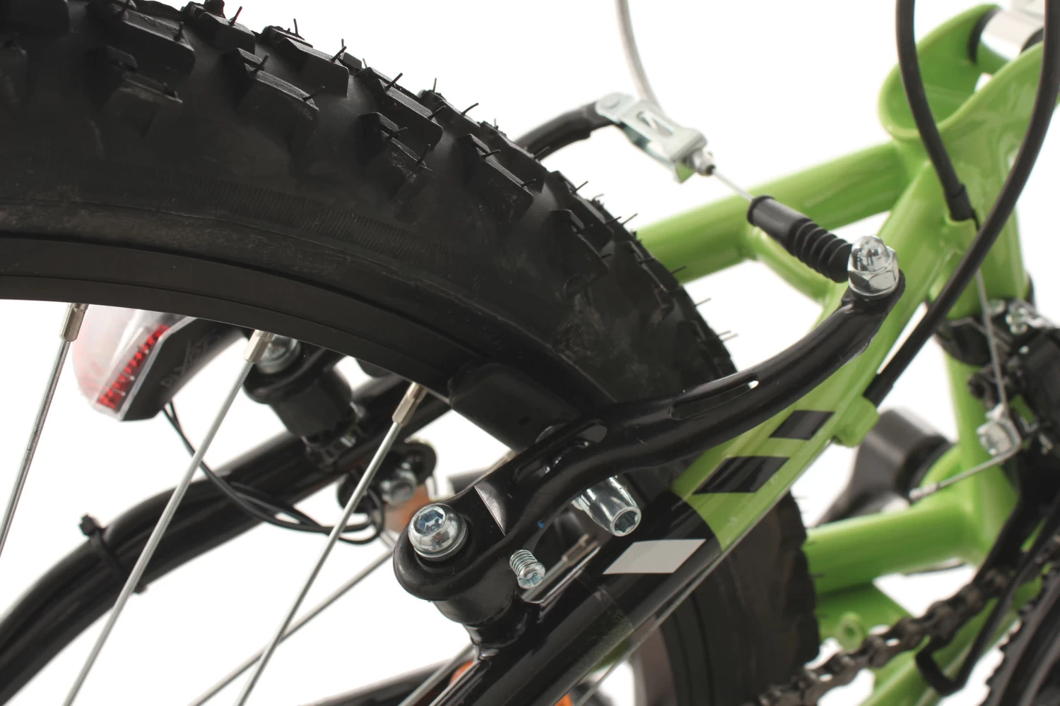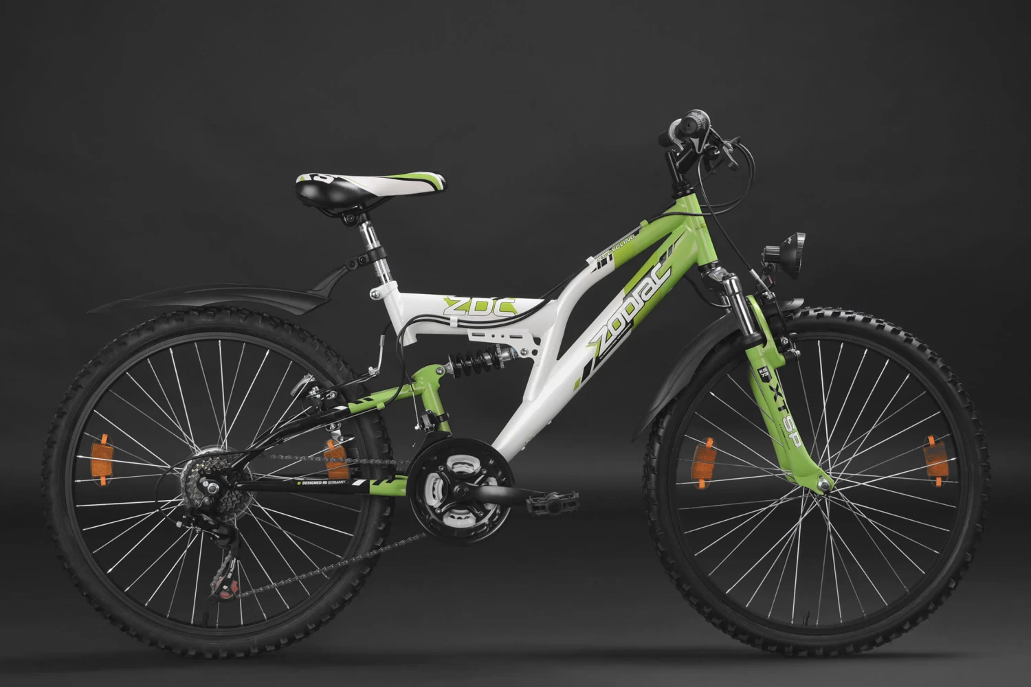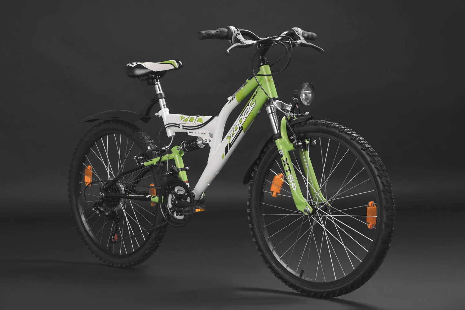 Die Basis bilden die Federgabel und der gefederte Rahmen. Die grobstolligen Reifen und das Design in Grün und Weiß machen das Kinderrad zu einem coolen Hingucker. Für Sicherheit sorgen dabei V-Brakes vorne und hinten und natürlich die dynamobetriebene Beleuchtung. Das Bike ist außerdem mit einer 18-Gang-Kettenschaltung von SHIMANO ausgestattet.