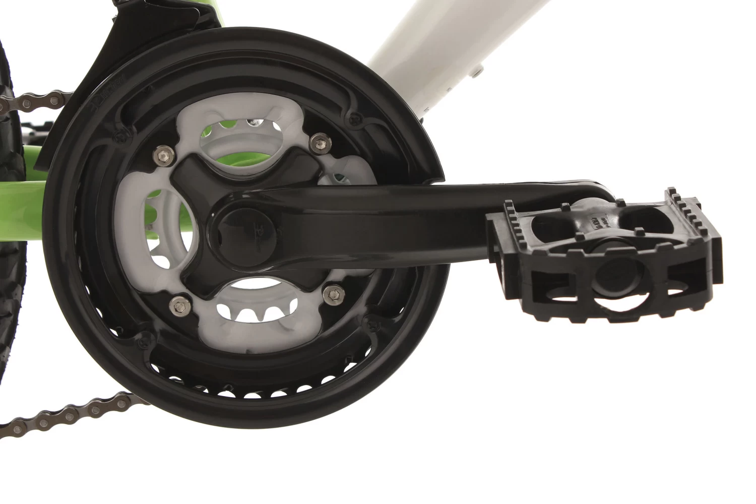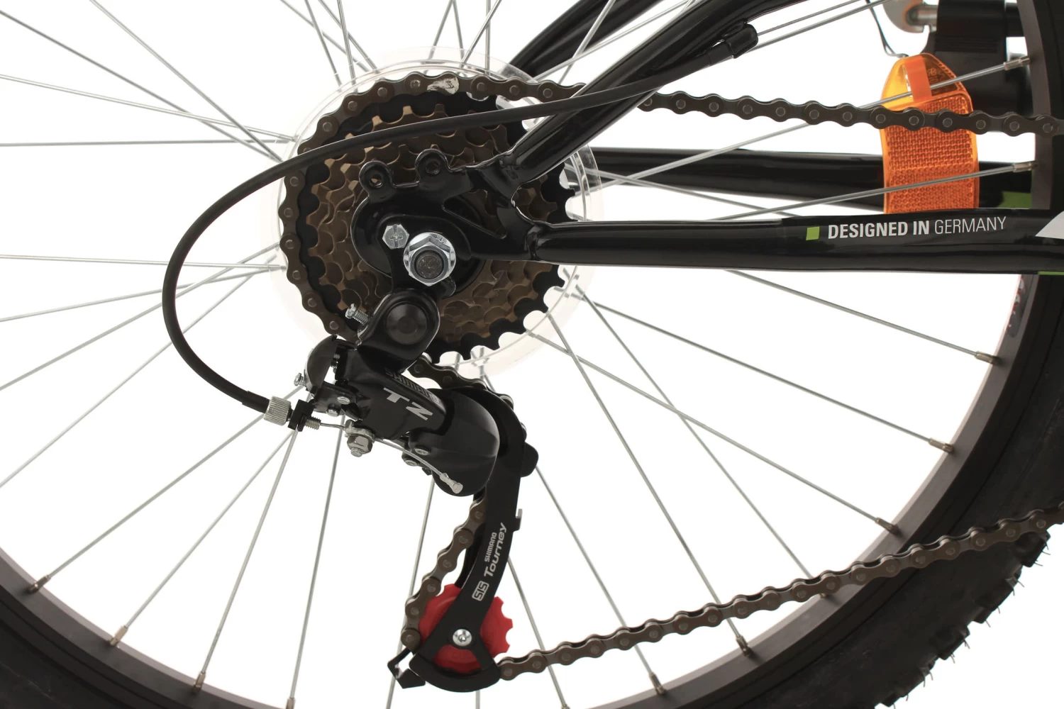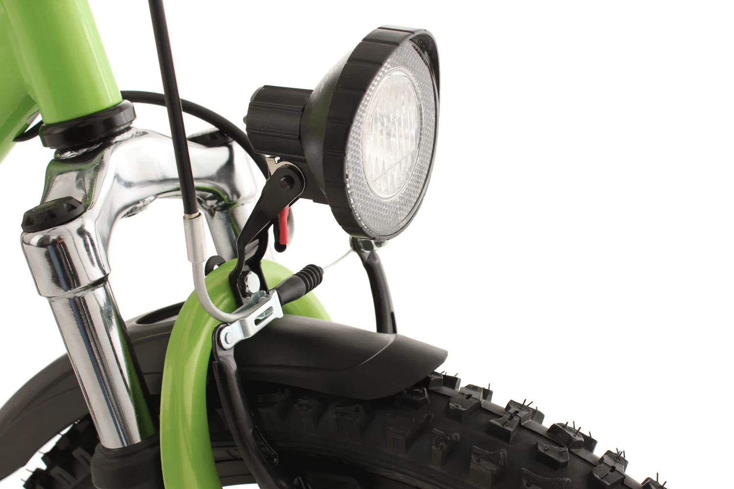 Die Basis bilden die Federgabel und der gefederte Rahmen. Die grobstolligen Reifen und das Design in Grün und Weiß machen das Kinderrad zu einem coolen Hingucker. Für Sicherheit sorgen dabei V-Brakes vorne und hinten und natürlich die dynamobetriebene Beleuchtung. Das Bike ist außerdem mit einer 18-Gang-Kettenschaltung von SHIMANO ausgestattet.