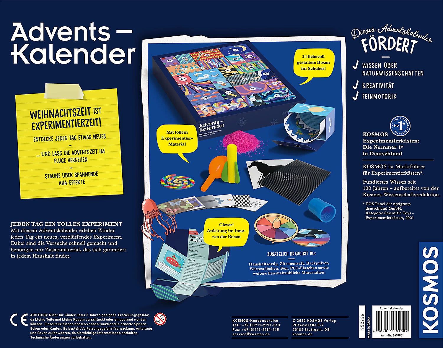 Im KOSMOS Adventskalender mit Wissenskick warten kleine, schnelle und vor allem verblüffende Experimente auf Kinder von 8 bis 12 Jahren! Alle 24 Versuche sind innerhalb von fünf Minuten durchgeführt und damit der perfekte Start in den Tag. Physik, Biologie und Chemie zum Anfassen – da staunt die ganze Familie über Alltagsphänomene! Einfach jeden Morgen eine der kleinen Schachteln öffnen und verblüffen lassen, wohin sie führt! Haben die Versuche neugierig gemacht? Dann verraten Zusatzinfos noch viel mehr über die spannenden Effekte und liefern tolles Hintergrundwissen. So macht das Warten auf Weihnachten sogar Spaß!