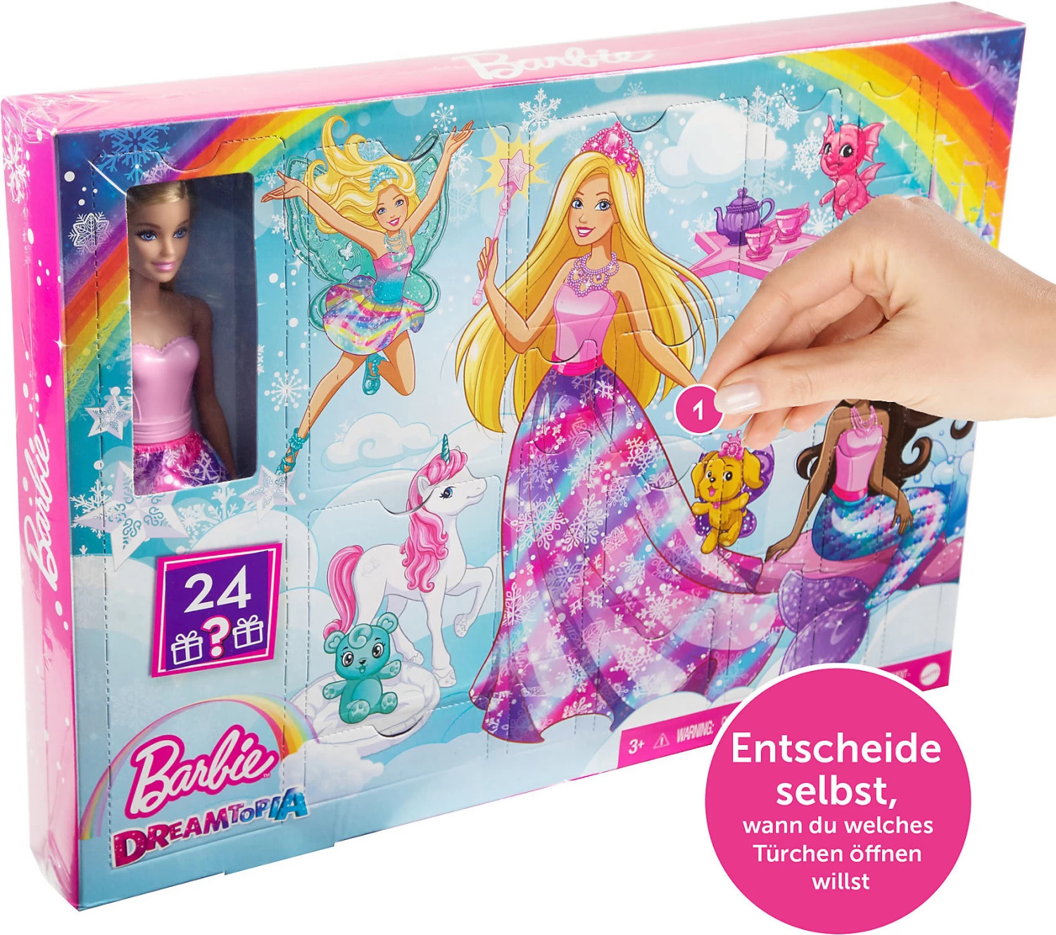 Barbie ist eine absolute Trendsetterin und kommt, um die Wartezeit bis Weihnachten zu verzaubern. Mit diesem bezaubernden Barbie Dreamtopia „Märchen-Adventskalender“ von Mattel kommen 25 Überraschungen zum Spielen, Stylen und Kombinieren. Hinter dem ersten der insgesamt 25 Überraschungstürchen finden kleine Barbie-Fans eine Barbie-Puppe die bereit ist mit jedem neuen Türchen bespielt zu werden. Die restlichen Türchen können in ihrer Reihenfolge frei gewählt werden. Zu den Überraschungen gehören Accessoires, wie bunte Schuhe, Diademe, Halsketten, ein Zauberstab und eine Haarbürste mit märchenhaften Details, um neue Looks zu kreieren. Außerdem dabei sind tolle Mode-Utensilien, wie Röcke, ein Paar Flügel und eine Meerjungfrauenflosse, damit Märchenfans die Barbie-Puppe in eine Prinzessin, Meerjungfrau oder Fee verwandeln können. Die 4 kleinen Tiere, als Begleiter für Barbie runden den Adventskalender ab. Mit dabei sind ein niedliches Hündchen, ein Häschen, ein Baby-Drache und ein Einhorn.
