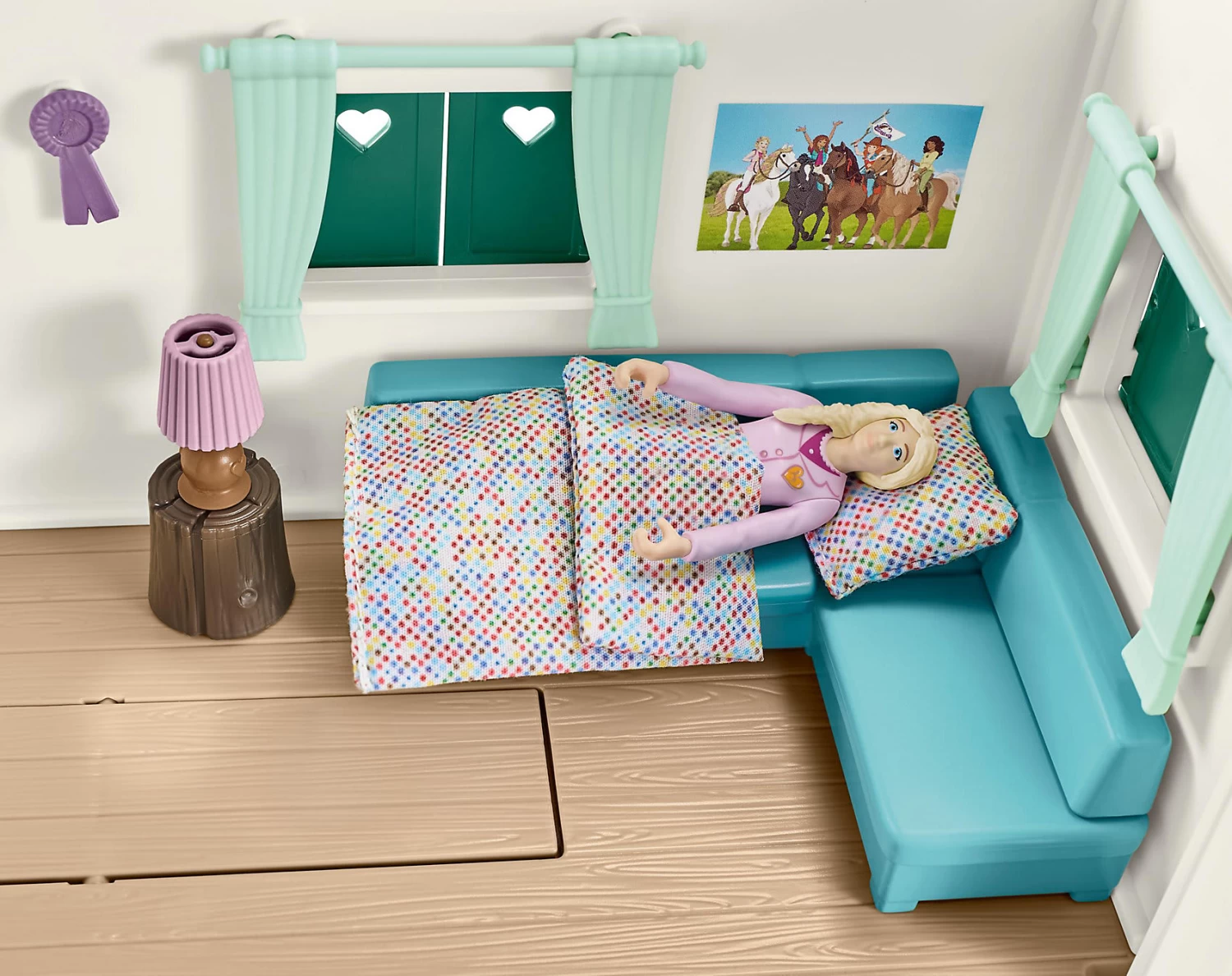 Pssst! Kichere nicht zu laut – schließlich darf niemand wissen, wo sich das Horse Club Hauptquartier befindet! Der Wohnwagen für geheime Club-Treffen ist für Hannah, Sofia, Lisa und Sarah der perfekte Ort, um ihre Zeit gemeinsam zu verbringen – als Horse Club! Unzählige Accessoires für gemeinsamen Pferdespaß! Jetzt mit voll beweglichen Horse Club Mädchen-Figuren und vielen Teilen mit Funktionen wie einem klappbaren Tisch, beweglichen Fensterläden und Türen, einem kippbaren Sonnenschirm sowie Kissen aus echtem Stoff!
